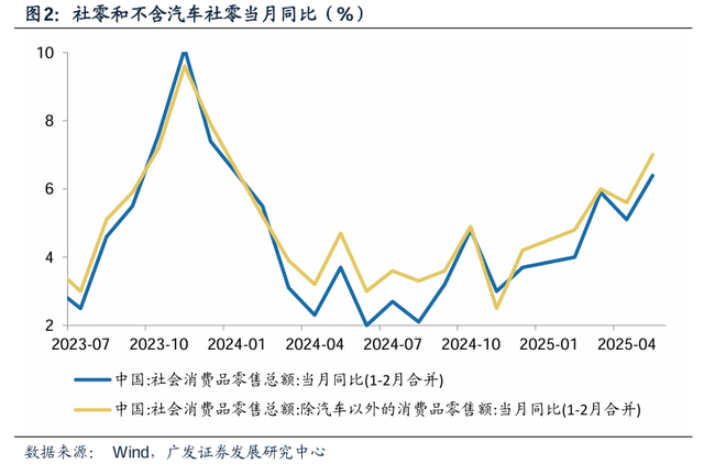 第三,社零增速出现跃升。5月同比达6.4%,其中城市消费修复速度更快,城市消费在2023年下半年-今年2月一直弱于农村消费,今年3月起开始高于农村,5月领先幅度进一步扩大。增速较高的门类包括家电、通讯器材、文化办公、体育娱乐、家具、金银珠宝、粮油食品、烟酒等,其中家电、通讯器材的增速均处于年内新高,显示“两新”的政策红利仍在集中释放期。增速较低的主要是化妆品、药品、汽车、石油制品,相对中性的是餐饮、建筑装潢等。这里面稍微有点反直觉的是汽车,乘联会口径5月广义乘用车销量同比13.9%,统计局口径同期汽车零售同比只有1.1%,价格收缩是导致这一差异的关键因素。