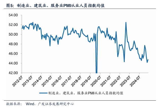 2025年5月PMI制造业从业人员指数为48.1,建筑业从业人员指数为39.5,服务业从业人员指数为46.6。