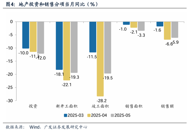 5月地产投资当月同比-12%,前值-11.3%;新开工面积当月同比-19.3%,前值-22.1%;施工面积累计同比由-9.7%回升至-9.2%;商品房销售面积当月同比-3.3%,前值-2.1%;商品房销售额当月同比-5.9%,前值-6.6%。