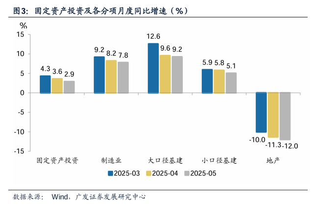 5月固定资产投资当月同比2.9%,前值3.6%;其中,制造业投资当月同比7.8%,前值8.2%;地产投资当月同比-12%,前值-11.3%;大口径基建投资当月同比9.2%,前值9.6%;小口径基建投资当月同比5.1%,前值5.8%。